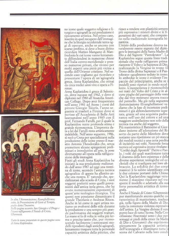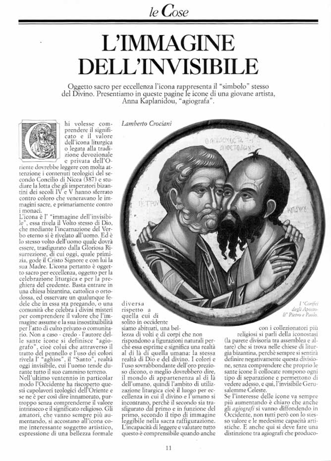 Μάρτιος 1993. Το περιοδικό τέχνης M.C.M. (Φλωρεντία) παρουσίασε το άρθρο "L'immagine dell' invisibile" (Η απεικόνιση του αοράτου) του καθηγητή p. Lamberto Crociani.